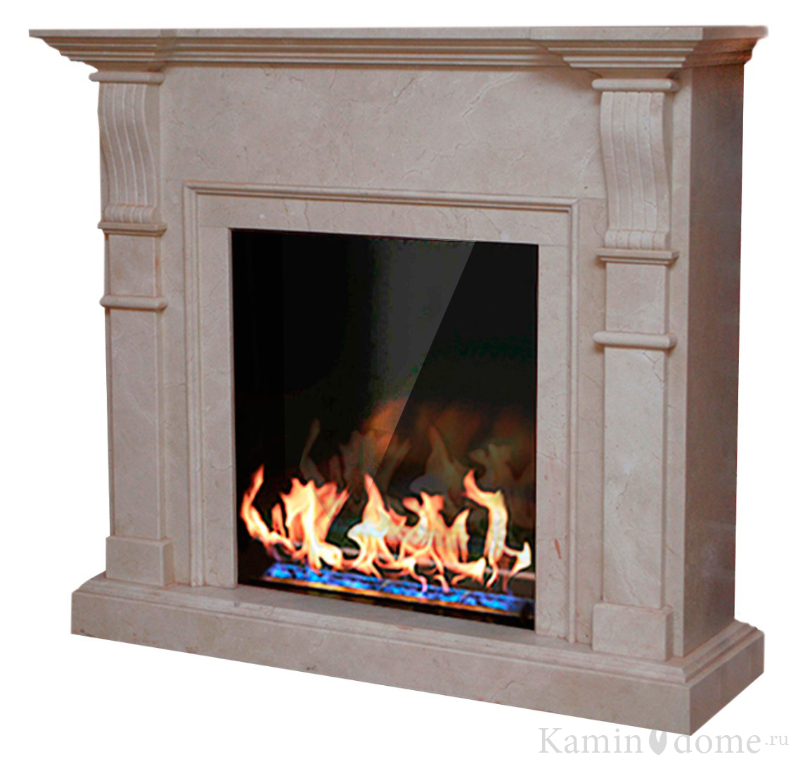 Портал из мрамора Крема Нова и Волокас, очаг стальной в порошковой окраске, топка из шлифованной нержавеющей стали