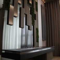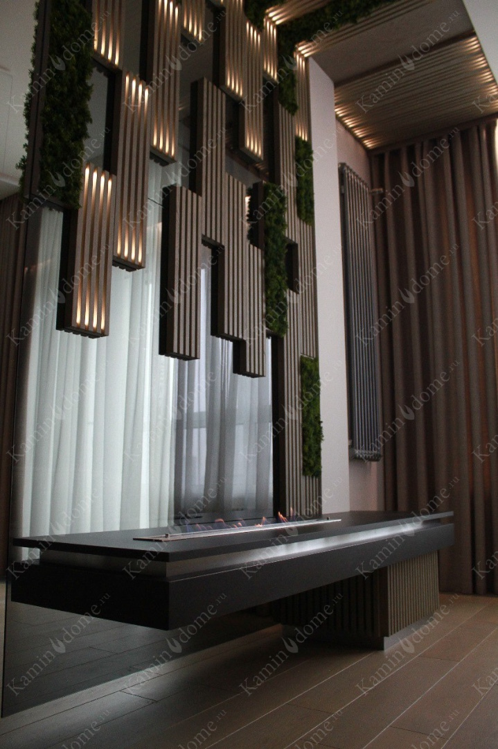 В данном проекте выбрано креативное решение по размещению биокамина: его разместили в парящей тумбе в гостиной. Ассимитричная консольная конструкция, подсветка и живой огонь однозначно обращают на себя внимание в интерьере. Пространство будто воздушное, живое. Дизайнеры позаботились о том, чтобы на вертикальных панелях были также размещены живые растения — мох. Зелень и языки пламени оживляют пространство.