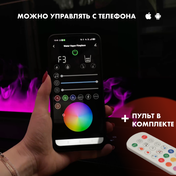 Нашим паровым камином BASE легко можно управлять с пульта дистанционного управления, приложения на телефоне или сенсорной панели. В целом, управление камином интуитивно понятное. Можно регулировать цвет пламени, высоту пара, включить или выключить музыкальное сопровождение, возможна функция автозакачки дистиллированной воды, установить таймер, через какое время паровой 3d камин выключится автоматически.