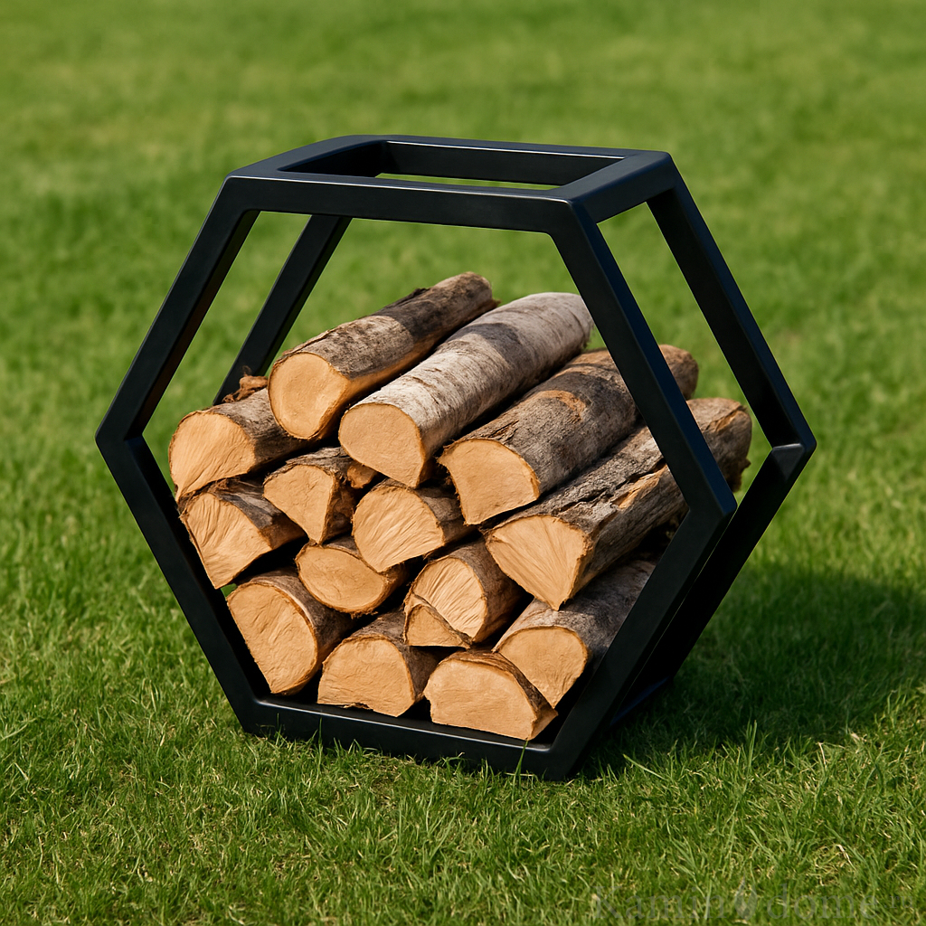 Конструкция выполнена из качественных материалов и обладает высокой устойчивостью, что делает её идеальной для использования на участке, возле дома или бани. Благодаря продуманной глубине и форме шестигранника дрова удобно укладывать — они не вываливаются и равномерно распределяются внутри. Металлическая рама обладает устойчивостью к нагрузкам и погодным условиям, что позволяет использовать дровник круглый год.