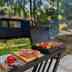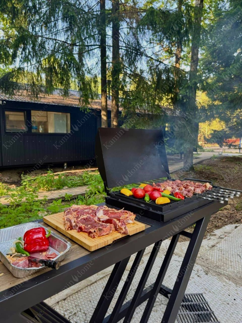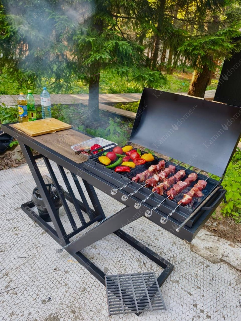 Стильный и минималистичный мангал лофт V ZEFIRE стал центром притяжения на корпоративе строительной компании. Массивный, надежный, устойчиво стоит на земле, не проваливается. Можно готовить в казане, на гриле или на шампурах. Любое блюдо от плова до овощей на гриле возможно реализовать на этом брутальном мангале ZEFIRE.