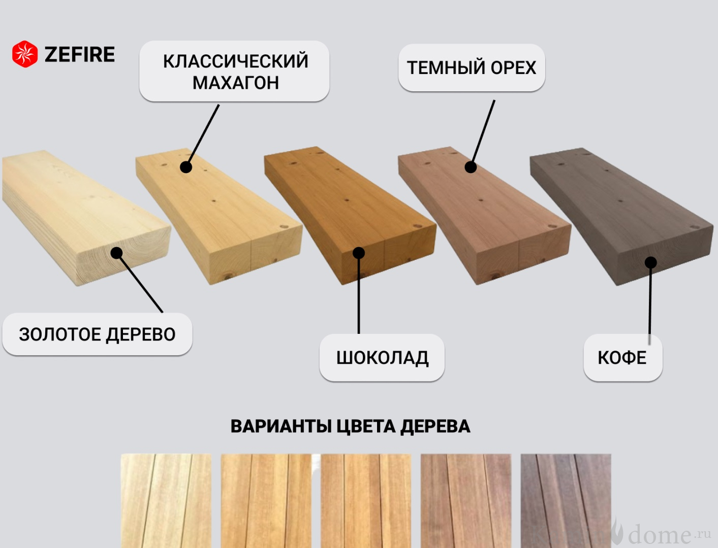 • Финишная обработка дерева: двухэтапная защита, включающая тонировку (доступно 5 цветов на выбор) и глубокую пропитку защитным мебельным маслом.