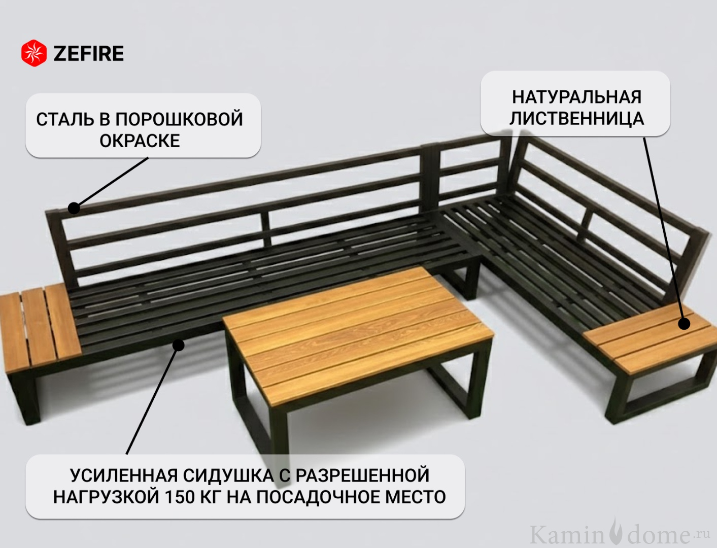 Сталь в порошковой окраске, лиственница высочайшего качества, покрытая специальной пропиткой и воском